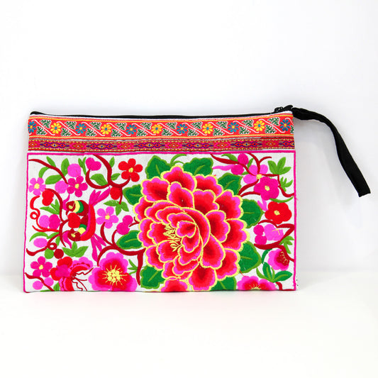 タイ製・刺繍ポーチ(ボンボン付・ピンク・大)