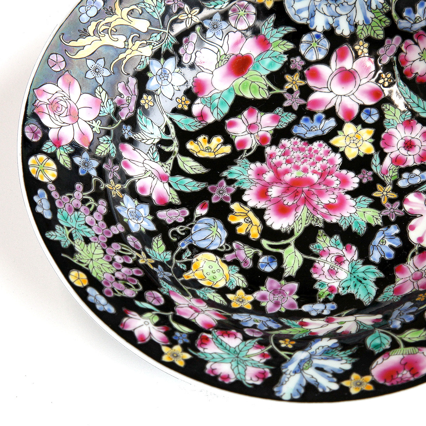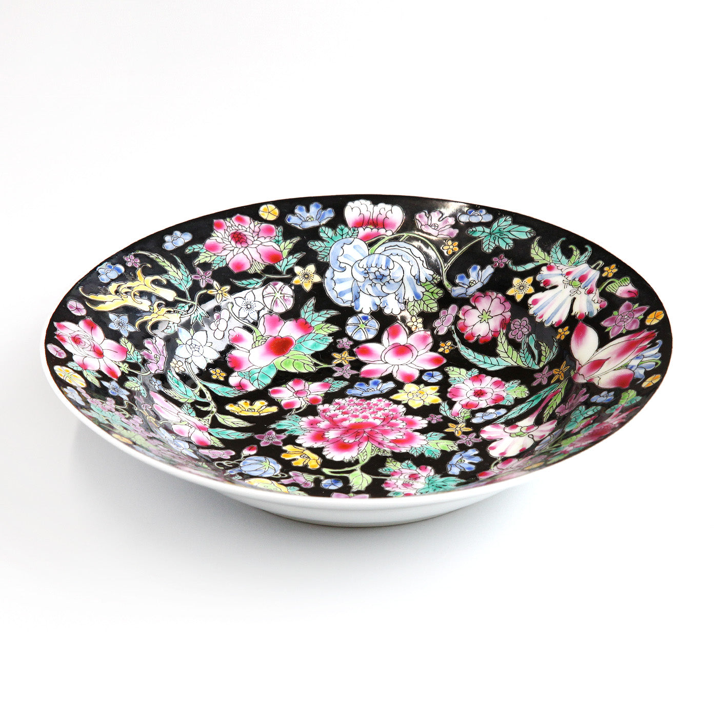 黒地を背景に、牡丹や菊、バラなど色とりどりの花々が華やかに描かれた豪華なデザインが特徴です。細やかな筆致と艶やかな色彩は、食卓を彩る実用的な器としてはもちろん、レトロチャイナなインテリアやコレクションアイテムとしても映える、存在感のある一枚です。贈り物にも。