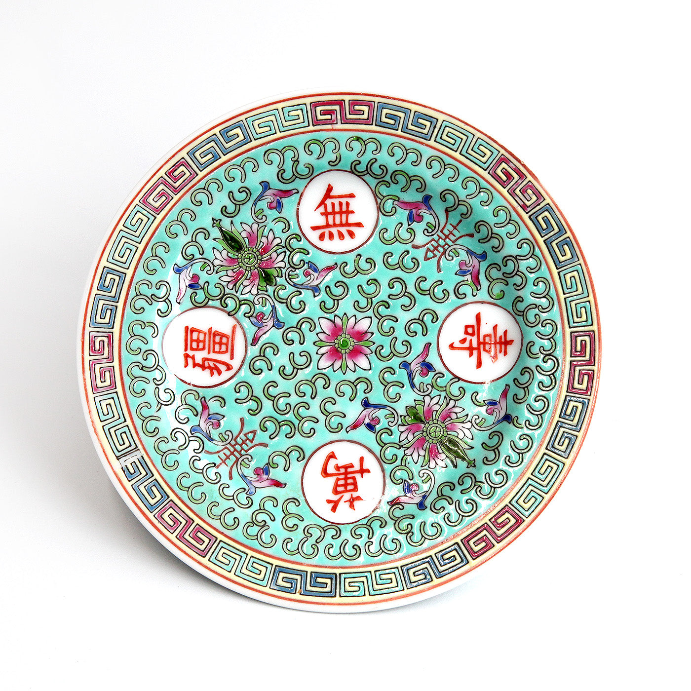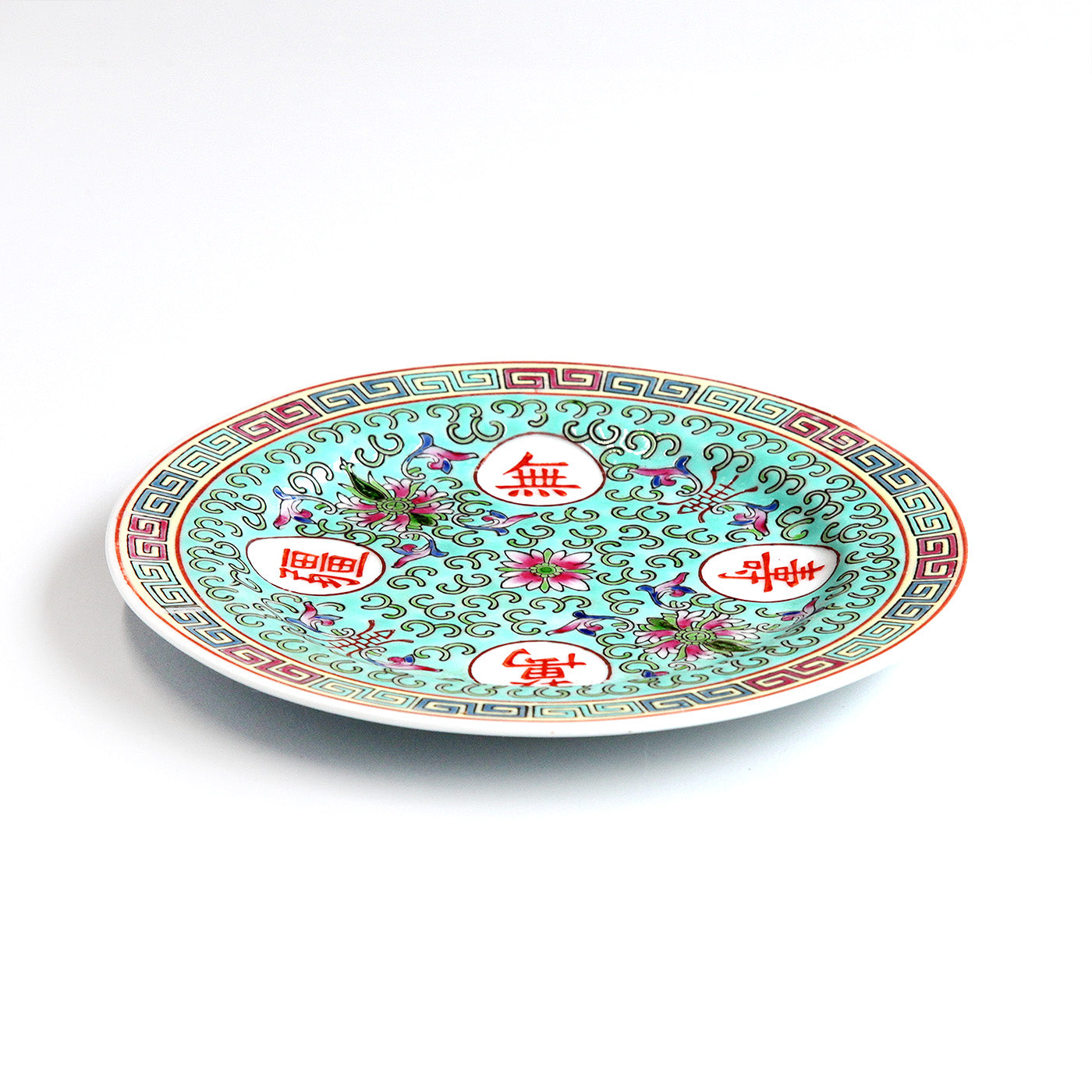 鮮やかな水色をベースに、赤い漢字と色とりどりの花模様が描かれた華やかなデザインが特徴です。縁には中華らしい雷文模様がぐるりと施され、まるで昔の中華料理店や家庭の食卓で使われていたような懐かしい雰囲気を漂わせています。インテリアとして飾っても存在感があり、中国レトロの魅力を感じさせる一枚です。