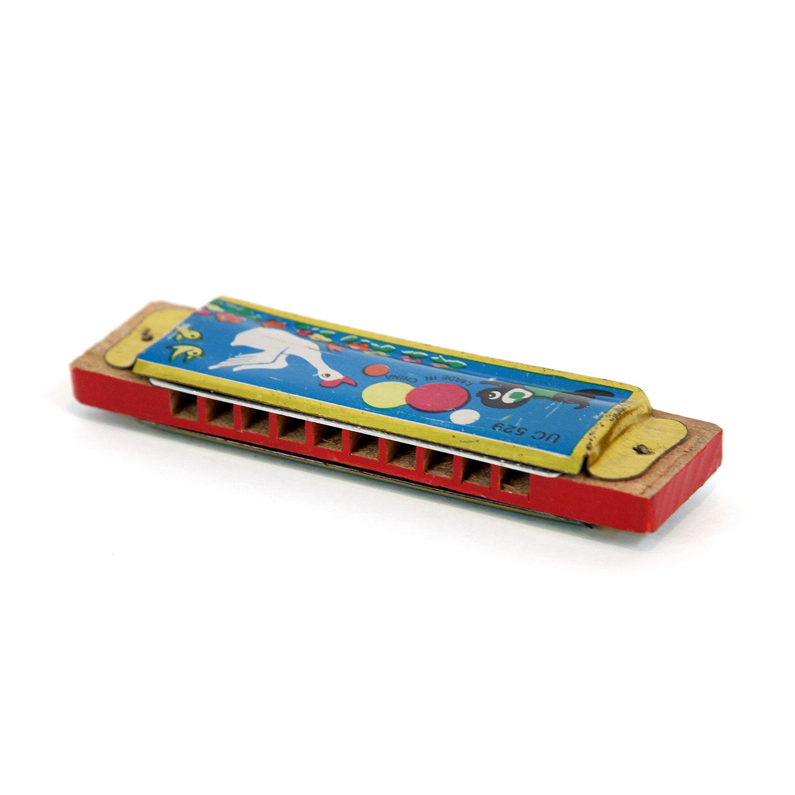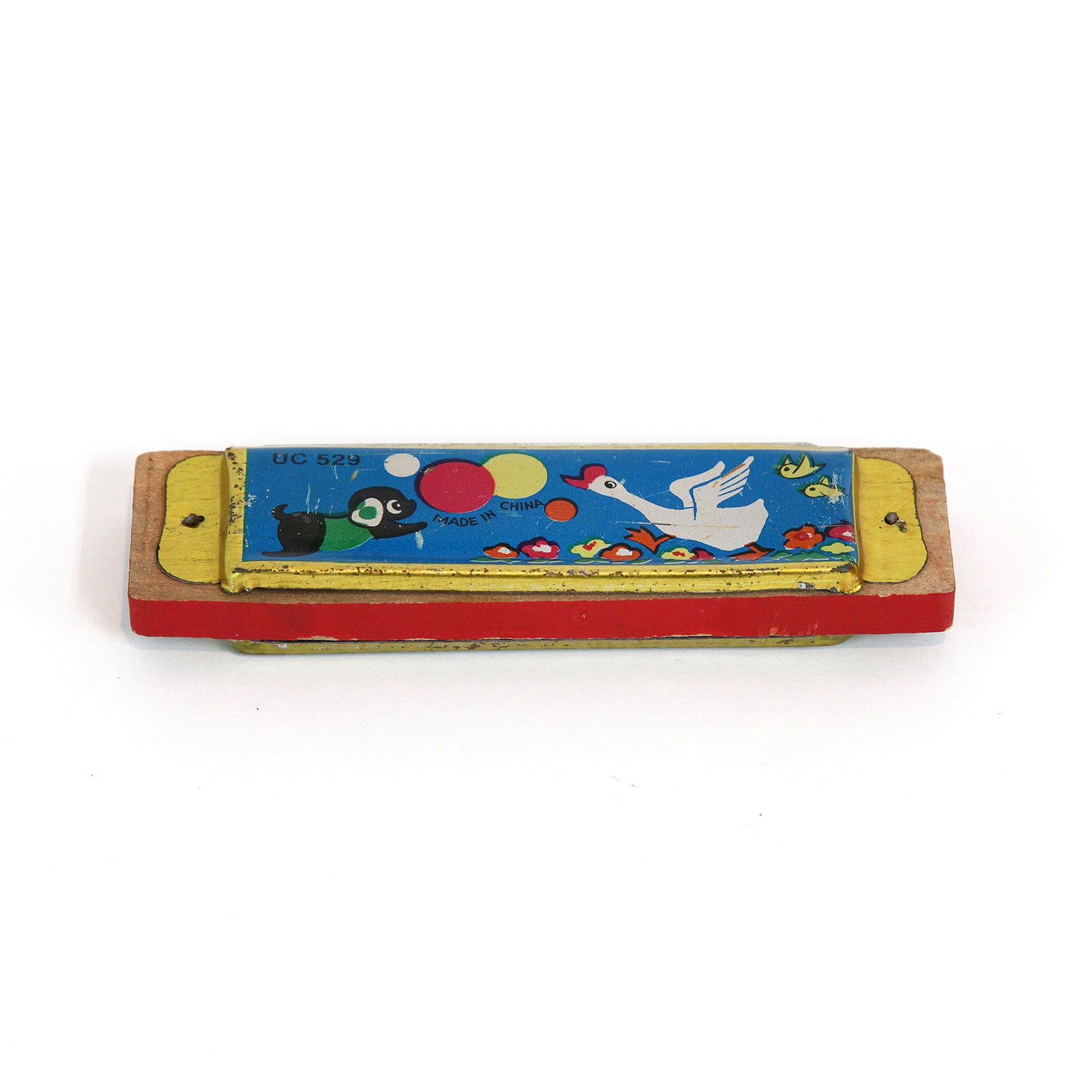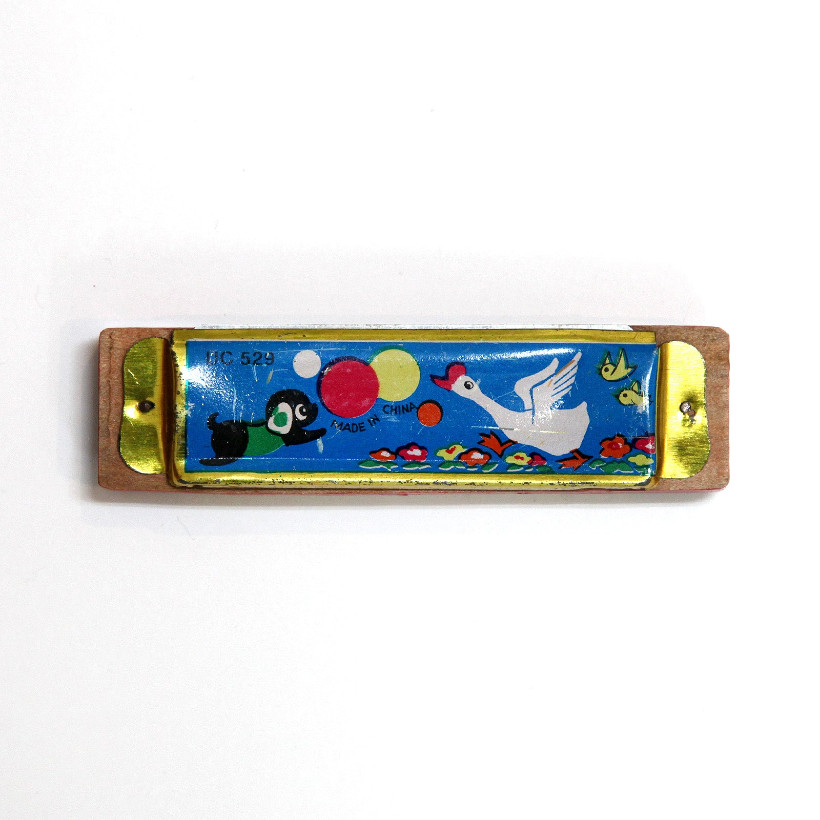 木製の手のひらサイズの小さなハーモニカ。レトロな雰囲気の動物や踊る子どもたち──昔懐かしい童話のような絵柄が、ノスタルジックです。吹けば素朴な音色がこぼれます。