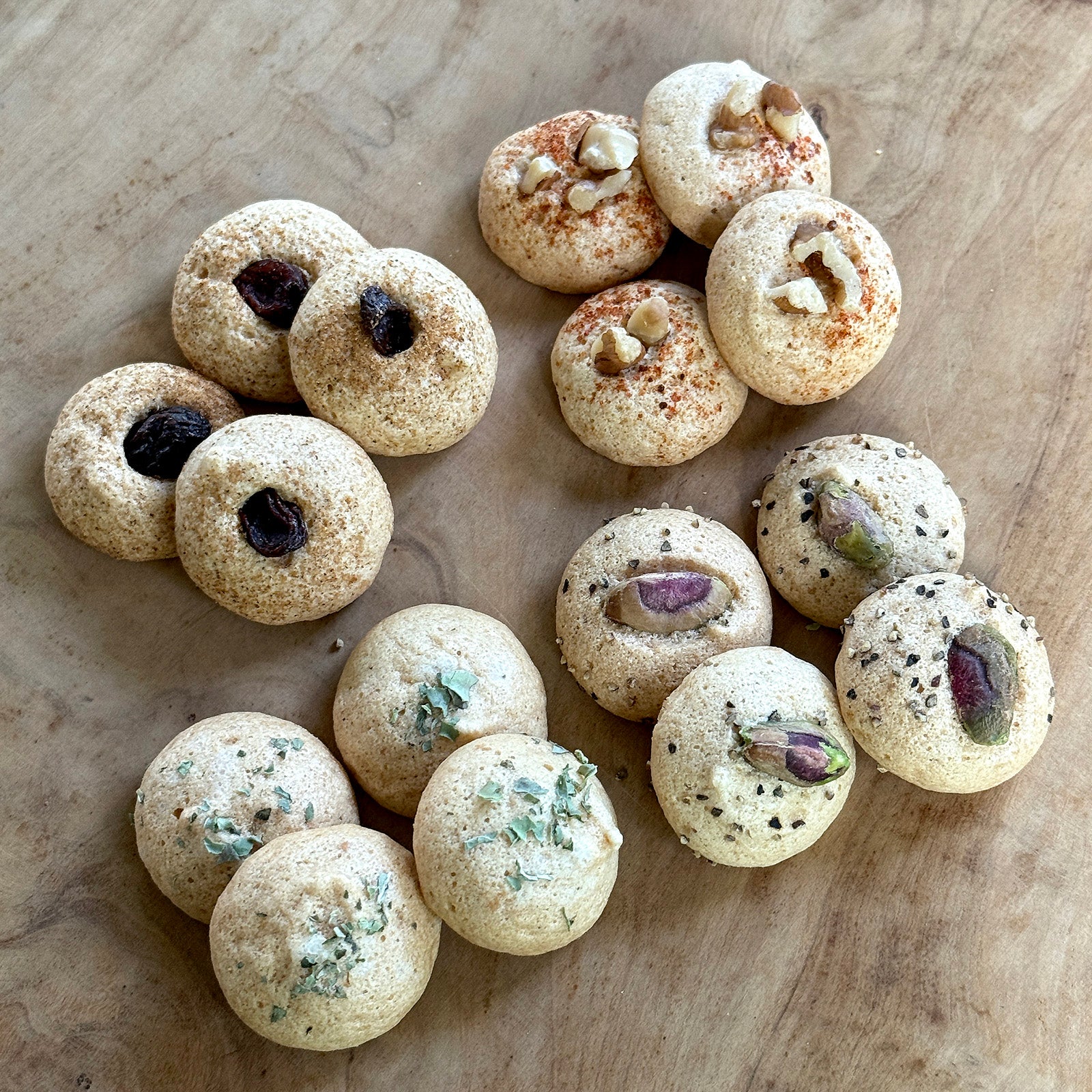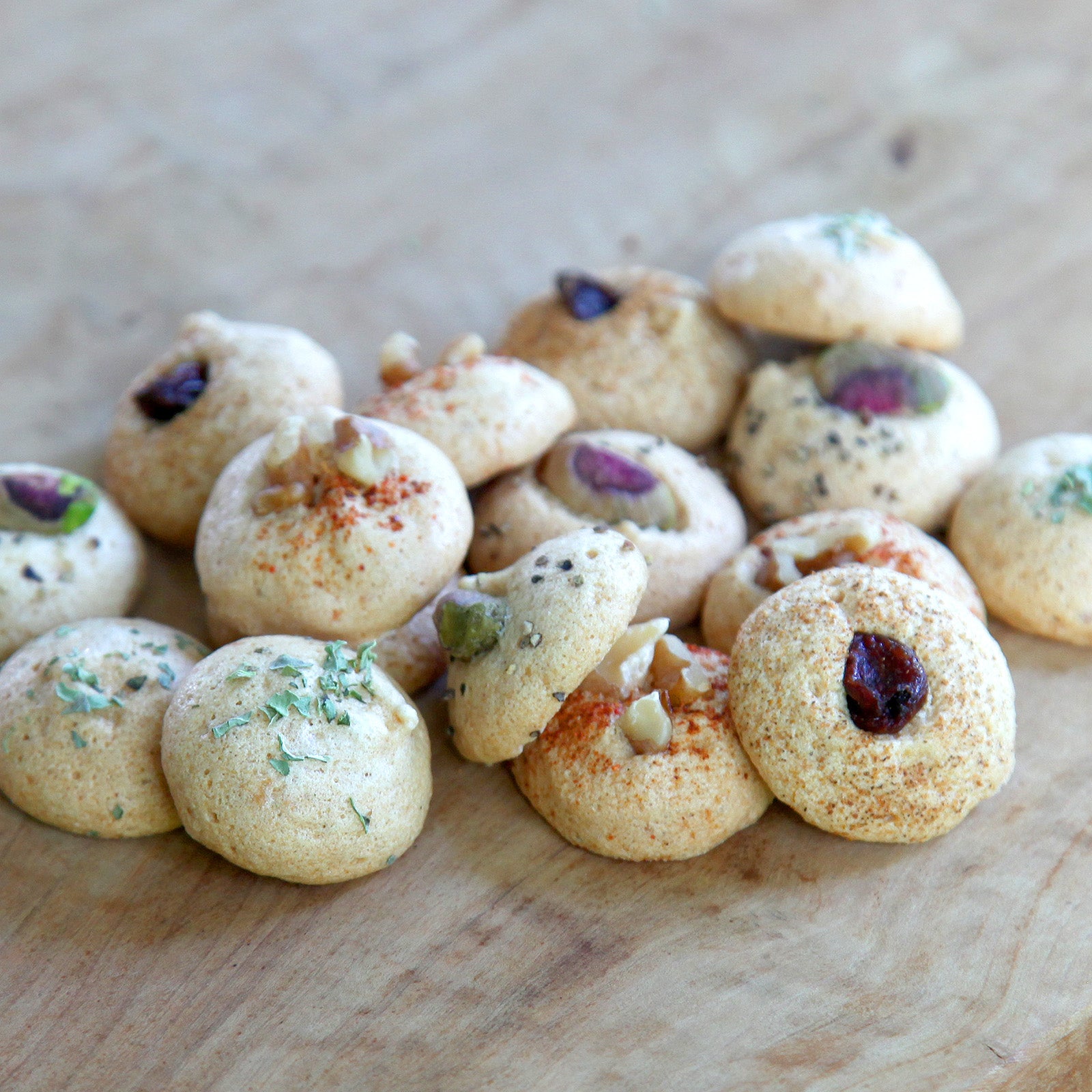 原材料 | SWEET:卵白(国産)、米粉(国産)、甜菜糖、こめ油、ココナツシュガー、イチゴパウダー、アーモンド、ココアパウダー、カカオニブ、桜の葉、イチゴフレーク SALTY:卵白(国産)、米粉(国産)、ピスタチオ、甜菜糖、レーズン、クルミ、こめ油、塩、胡椒、赤唐辛子、ガラムマサラ(ブラックペッパー、コリアンダー、赤唐辛子、カルダモン、ホワイトペッパー、クミン、クローブ、シナモン)、バジル |