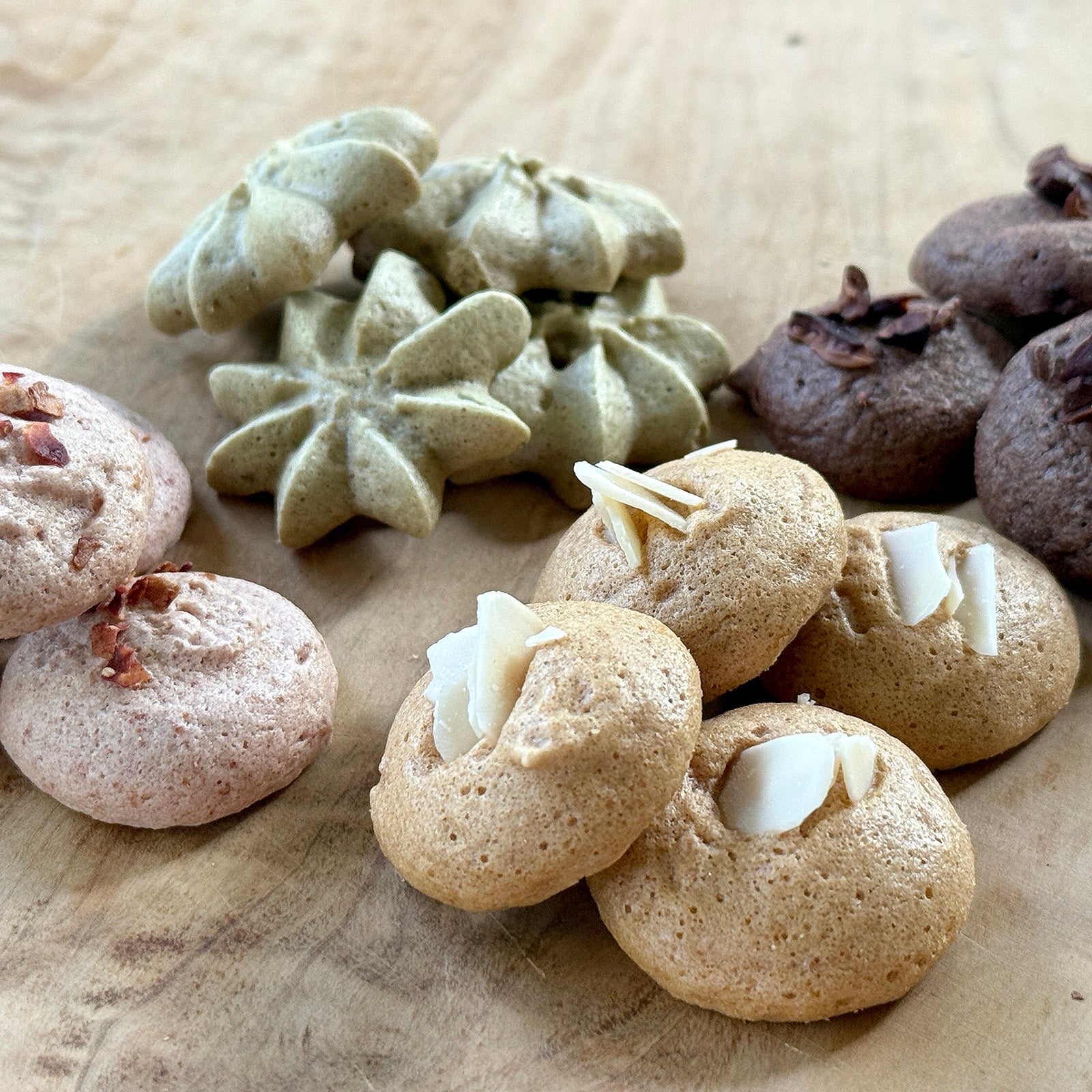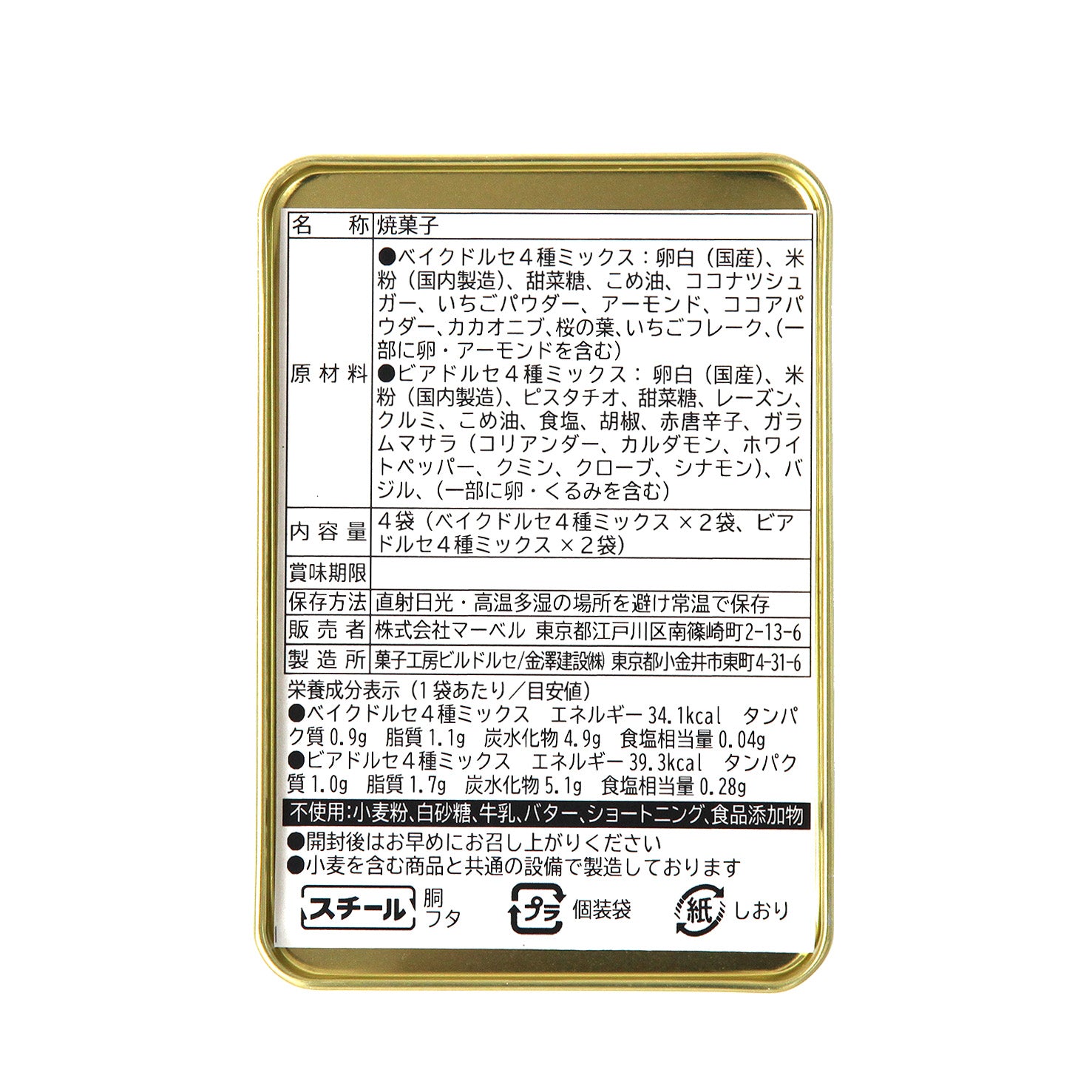 原材料 | SWEET:卵白(国産)、米粉(国産)、甜菜糖、こめ油、ココナツシュガー、イチゴパウダー、アーモンド、ココアパウダー、カカオニブ、桜の葉、イチゴフレーク SALTY:卵白(国産)、米粉(国産)、ピスタチオ、甜菜糖、レーズン、クルミ、こめ油、塩、胡椒、赤唐辛子、ガラムマサラ(ブラックペッパー、コリアンダー、赤唐辛子、カルダモン、ホワイトペッパー、クミン、クローブ、シナモン)、バジル |